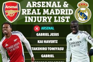 阿森纳伤停:热苏斯、哈弗茨、富安健洋、加布里埃尔、卡拉菲奥里